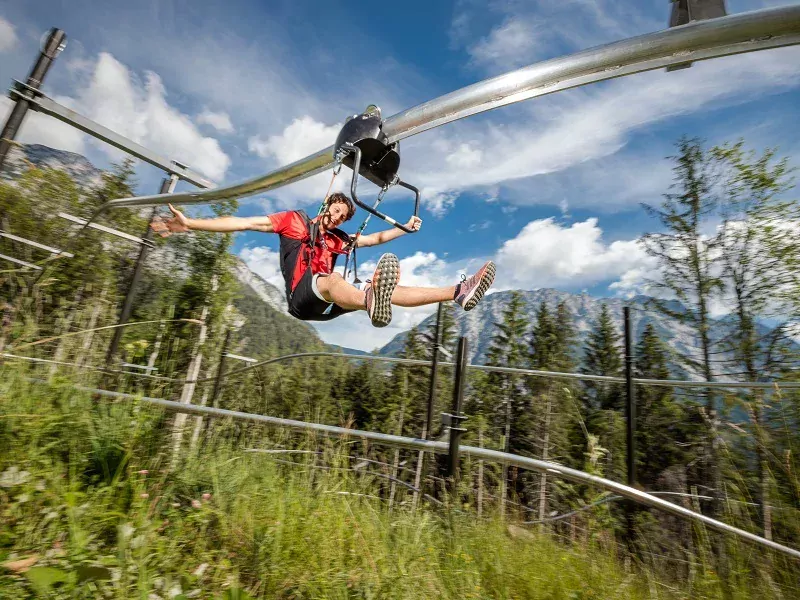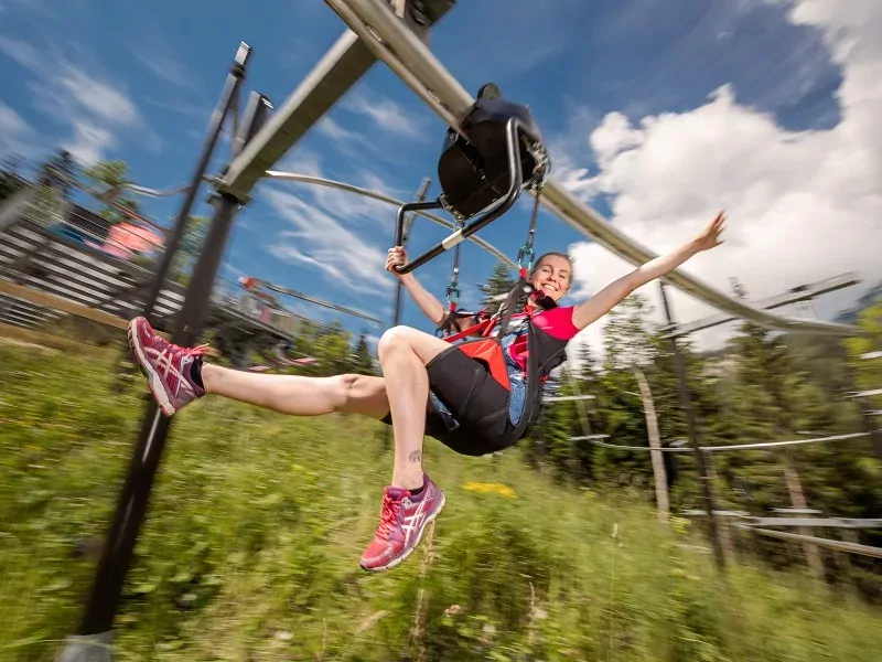 Je staat op 1.600 meter boven zeeniveau en je kijkt uit over de vallei. Ga zitten in de speciale zipline en tel samen af: 3, 2, 1… daar ga je! Voel hoe je steeds sneller naar beneden zoeft. En bij het eindpunt van de zipline ben je nog maar halverwege de berg. Klaar voor de bosachtbaan? Suis met hoge snelheid dwars door het bos naar beneden, een adrenalinekick die je niet snel vergeet!