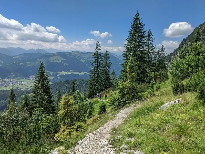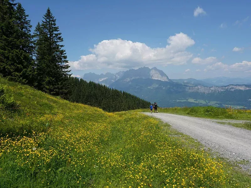 De eerste wandeling van de vakantie neemt je mee door een afwisselend en schilderachtig berglandschap. Vanuit het dorpscentrum slinger je langs de uitgestrekte 27-holes golfbaan en wandel je rustig omhoog door het pittoreske district Wimm richting het gebied Riesen. Een brede bosweg leidt je naar het Biedringer Plateau, waar een korte pauze wordt beloond met een adembenemend uitzicht over de omliggende bergen en dalen. Via een rustige, bosrijke route keert het pad uiteindelijk terug naar het dorp, perfect om de eerste dag in de Wilder Kaiser ontspannen af te sluiten.